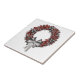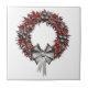 Este diseño de cerámica festiva presenta una corona de invierno roja y plateada con bayas y un arco de cinta de plata. Hay indicios de blanco y negro en la corona.