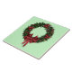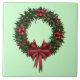 Este diseño de cerámica festiva incluye una corona de invierno roja y verde con bayas y un arco de cinta roja. Hay indicios de plata y oro en la corona.