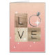 Celebra el amor, el romance y los futuros nupciales con este hermoso diseño que incluye azulejos de letras de madera y un anillo de compromiso para deletrear la palabra AMOR.