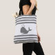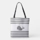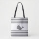 Bella ballena con la bolsa de la tote gris y blanca a rayas.