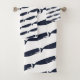 Siluetas modernas de ballena azul marino sobre blanco. Estas toallas son una gran adición al baño náutico.