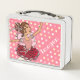 Divertido rojo brillante y rosa con puntos de polka bailarina bonito chica llamada caja de almuerzo id. Perfecto para los chicas de pelo oscuro bailando para asistir a clases de escuela o ballet. Personalizar con el nombre de su hijo. Actualmente se lee Imogen. Ilustrado y diseñado exclusivamente por Sarah Trett para www.mylittleeden.com