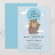 Oso lindo volando en un globo caliente chicos de la invitación a la ducha bebé.