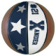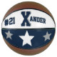 Se trata de un baloncesto de tamaño completo con dos paneles diseñados con un nombre de monograma (primera letra grande) y un número uniforme, en los colores populares de la universidad. Esta se muestra en azul, gris y blanco. El segundo panel tiene colores de equipo con tres estrellas. Todo el texto, el arte y los colores se pueden eliminar o cambiar según se desee. Un panel puede dejarse blanco para autógrafos, etc.
