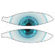 Un ojo cibernetico azul con varias pantallas digitales, incluyendo círculos, puntos y cuadrados, algunos iluminados y otros no, con un pequeño cruce en el medio y la palabra "visión" hacia atrás en la parte inferior derecha.
