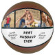 Un regalo divertido para el mejor marido que ama el baloncesto. Puedes personalizar con tres fotos y personalizar el texto del "mejor esposo de la historia" en el medio, un mensaje a la izquierda ("Feliz Cumpleaños", "Feliz Navidad", etc.), y tu firma y nombre a la derecha.