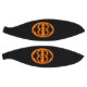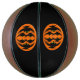 Este impresionante baloncesto presenta un oval naranja con seis cuervos. Cada cuervo tiene ojos amarillos con pupilas negras y alas estiradas. Los cuervos están volando unos hacia otros formando una forma oval. El fondo es negro.
