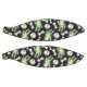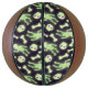Dibujos de un lindo esqueleto espeluznante, huesos y cráneos que parecen verdes brillan en el color oscuro sobre un fondo negro morado oscuro y estrellas del espacio púrpura en sus ojos. Están dispuestas en un patrón de halloween no direccional. Por favor, tenga en cuenta que esta impresión no brilla en la oscuridad, sino que es sólo una obra de arte que hice para parecerme a un resplandor en la oscuridad.