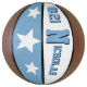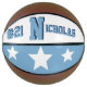Se trata de un baloncesto de tamaño completo con dos paneles diseñados con un nombre de monograma (primera letra grande) y un número uniforme, en los colores populares de la universidad. Esta se muestra en azul y blanco. El segundo panel tiene colores de equipo con tres estrellas. Todo el texto, el arte y los colores se pueden eliminar o cambiar según se desee. Un panel puede dejarse blanco para autógrafos, etc.