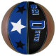 Se trata de un baloncesto de tamaño completo con dos paneles diseñados con un nombre de monograma (primera letra grande) y un número uniforme, en los colores populares de la universidad. Esta se muestra en negro, azul y blanco. El segundo panel tiene colores de equipo con tres estrellas. Todo el texto, el arte y los colores se pueden eliminar o cambiar según se desee. Un panel puede dejarse blanco para autógrafos, etc.