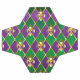 joyas, fondo del Mardi Gras de rhombus violeta y verde, lirios dorados decorados.