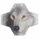 Rostro de un lobo de madera gris con brillantes ojos naranjas. Obra de arte realista creada a partir de una pintura al óleo original de Crista S, artista ecuestre y salvaje.Bosque.