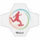 La imagen es de un dramático futbolista en proceso de patear la pelota. La imagen se enmarca dentro de un círculo roto. Los colores son rojo, azul, verde y salmón. Su nombre u otro texto personalizado está en negro en la parte inferior de la imagen. *La imagen prediseñada utilizada en este diseño está protegida por derechos de autor por Encore Software, Inc., que permite su uso a sus licenciantes. Todos Los Derechos Reservados.