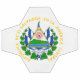 Sobre ella hay un arco iris que significa paz. Detrás del escudo de armas hay cinco banderas que representan las banderas de la República Federal de Centroamérica izadas. Debajo hay un pergamino que establece el lema nacional de El Salvador: Dios, Unión, Libertad. Todo ello rodeado por una guirnalda de laurel, atada bajo la bandera nacional. La guirnalda se divide en 14 partes diferentes, que simbolizan los 14 Departamentos, las unidades administrativas subnacionales salvadoreñas. Todo ello rodeado de letras doradas, que forman la palabra española REPÚBLICA DE EL SALVADOR EN LA AMÉRICA CENTRAL: República de El Salvador en América Central).