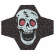 Esta pelota de fútbol tiene un cráneo blanco con grietas y grandes ojos falsos purpurinas rojos sobre un fondo negro con puntos rojos profundos.