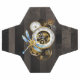 Diales antiguos con artes de oro y latón, decorados con libélula mecánica sobre fondo marrón, rayado. Steampunk.