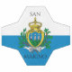 El estado y la bandera de guerra de San Marino están formados por dos bandas horizontales iguales de blanco (superior) y azul claro con el escudo nacional de armas superpuesto en el centro; el escudo de armas tiene un escudo (con tres torres sobre tres picos) con una corona cerrada en la parte superior, flanqueada por una corona de roble y laurel, con un desnivel por debajo de la palabra LIBERTAS (Libertad). Los dos colores de la bandera representan paz (blanca) y libertad (azul celeste).