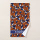 Esta fresca toalla con tema de baloncesto muestra un patrón aleatorio de baloncesto de tamaño variado girado de todas formas en un fondo color orangey-marrón-baloncesto (no estoy muy seguro de cómo llamarlo haha - de todas maneras, ¡es personalizable!) - dos paneles de cada baloncesto son coloreados—uno azul y uno blanco - personalizan la toalla de baño y la toalla de mano con su nombre en un ancho completamente negro. banda de color azul - de katz_d_zynes