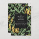 Estas modernas y extravagantes tarjetas de Invitación "The Bunch Has Moved" incluyen bananas amarillas hechas a mano y hojas de plátano verde sobre un fondo negro con sutiles detalles de raindrop. La parte posterior presenta el mismo patrón.