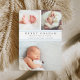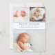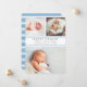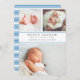 Anuncie la llegada de su dulce bebé con nuestros anuncios de natalidad de collage con elegantes letras grises de carbón vegetal y detalles de rayas azules de Carolina. Las tarjetas planas incluyen tres de tus fotos favoritas de recién nacidos — dos en la parte superior, y una en la parte inferior — con el nombre del bebé, estadísticas de nacimiento y nombres de familia en gris carbón de moda, enmarcadas por dos delgadas bandas de azul claro. Las tarjetas cambian a las rayas azules y blancas de Carolina.