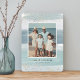 La tarjeta de vacaciones de estilo costero de moda añade un toque náutico a tus saludos navideños. Perfecto para compartir una foto de vacaciones, o para familias que viven en lugares costeros, tropicales, cálidos o isleños, este elegante diseño presenta su foto favorita sobre un fondo de rayas de color verde marino y acuático, con falsos purpurinas en la parte superior e inferior. Añada su mensaje de vacaciones personalizado (que se muestra con "mares y saludos") y sus nombres o apellidos. Personalice la parte posterior con tres fotos adicionales.