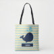 Bandas de chevron azules, amarillas y blancas con una ballena azul marino con agua a rayas azules y blancas y un área que puedes añadir un nombre.