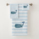 Disfruta de nuestra toalla de rayas azules pintada por ballenas náuticas.