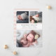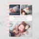 Anuncie la llegada de su bebé con nuestro collage de fotos con elegantes letras grises y detalles rosa rubor. Las tarjetas planas incluyen tres de tus fotos favoritas de recién nacidos — dos en la parte superior, y una en la parte inferior — con el nombre del bebé, estadísticas de nacimiento y nombres de familia en gris carbón de moda, enmarcadas por dos delgadas bandas de color rosa pastel. Las tarjetas se revierten a rayas blancas y negras.