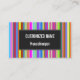 Este diseño de tarjeta de visita presenta un patrón de rayas (o líneas) de varios colores. En la parte delantera también hay un espacio rectangular de color oscuro con un nombre y una profesión/rol/título/posición que pueden ser personalizados. La parte posterior presenta un diseño sencillo que incluye un nombre, una profesión/rol/título/posición, y detalles de contacto que se pueden personalizar. Este diseño de tarjeta de visita podría ser utilizado por un profesional, o tal vez por un propietario de una pequeña empresa. [~Z0000061]