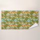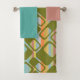 Este conjunto de toallas incluye un lavabo de color ladrillo, una toalla de mano turquesa y una toalla de baño de diseño moderno de mediados de siglo de rectángulos verdes redondeados con agujeros sobre un fondo de rayas de colores modernos de mediados de siglo. Si te gusta el diseño pero prefieres colores diferentes, envíame un mensaje.