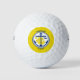 Bolas de golf con la ciudad de Anchorage, Alaska; bandera amarilla con sello blanco con un ilustracion de un barco y ancla azul