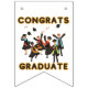Este diseño de bandera de banderines presenta las palabras "Congrats Graduate" con fuente de letra mayúscula y letras de color gris con contorno amarillo que muestra a los estudiantes celebrando después de una graduación en este tema de educación. Todas las banderas tienen impresión de un solo lado, seguras para exteriores, hechas con poliestireno de plástico resistente y una cuerda de plástico gruesa tiene (16) banderines con cola de golondrina de 5,5" x 8" en una cuerda de 6' de largo.