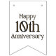 Esta bandera de bunting presenta las palabras "Feliz 10º Aniversario" en una fuente de impresión única con letras doradas y contorno negro. Todas las banderas tienen impresión a un lado, son seguras para exteriores, hechas de plástico de poliestireno resistente y cuerda de plástico grueso, y tienen (16) banderines swallowtail de 5,5" x 8" en una cuerda de 6' de largo.