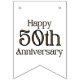 Esta bandera de bunting presenta las palabras "Feliz 50 Aniversario" en una fuente de letra única con letras doradas y contorno negro. Todas las banderas tienen impresión de un solo lado, son seguras para exteriores, están hechas de plástico de poliestireno resistente y tienen una cuerda de plástico gruesa con (16) banderas de cola de golondrina de 5,5" x 8" en una cuerda de 6 pies de largo.