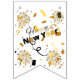 Esta bandera de Bunting muestra las palabras "Feliz Año Nuevo" en una fuente de letra única/negrita con letras negras y doradas, más fuegos artificiales, formas de confeti y patrones en este tema y estilo de Año Nuevo. Todas las banderas tienen impresión de un solo lado, seguras para exteriores, hechas con poliestireno de plástico resistente y cuerda de plástico grueso, tiene (16) banderines de cola de golondrina de 5,5" x 8" en una cuerda de 6' de largo.