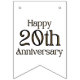 Esta bandera de bunting presenta las palabras "Feliz 20º Aniversario" en una fuente de letra única con letras doradas y contorno negro. Todas las banderas tienen impresión de un solo lado, seguras para exteriores, hechas de plástico de poliestireno resistente y cuerda de plástico gruesa, tiene (16) banderines de cola de golondrina de 5,5" x 8" en una cuerda de 6' de largo.