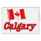 Grandes letras rojas deletrean Calgary, una ciudad importante en la provincia de Alberta, con una ondulada bandera canadiense ondeando detrás. Este diseño está disponible en una gran variedad de camisetas, regalos y otras prendas.