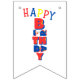 Esta bandera de cumpletazos muestra las palabras "Feliz Cumpleaños" en una fuente de impresión única, estilo y ubicación con letras rojas, azules y amarillas más un sombrero de cumpleaños con serpentinas en este tema y estilo de cumpleaños. Todas las banderas tienen impresión de un solo lado, seguras para exteriores, hechas con plástico rígido de poliestireno y una cuerda de plástico gruesa tiene (16) banderines swallowtail de 5.5" x 8" en una cuerda de 6' de largo.