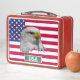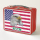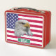 Muestra tu patriotismo con este Lunch Box que incluye el Star Spangled Banner de los EE.UU. con un gráfico del águila calva en ambos lados. El texto puede cambiarse para adaptarlo a sus necesidades.