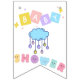 Esta bandera de guirnalda presenta las palabras "Baby Shower" en una fuente de impresión única con letras de diferentes colores con una nube y gotas de lluvia en este tema de estrellas y animales. Todas las banderas tienen impresión a un lado, seguras para exteriores, hechas con poliestireno de plástico resistente y una cuerda de plástico gruesa tiene (16) banderines swallowtail de 5.5" x 8" en una cuerda de 6' de largo.