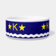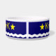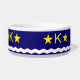 Tazón de mascotas con diseño con bandera de Kinshasa, capital de la República Democrática del Congo, bandera azul con ola blanca, dos estrellas doradas y letra ‘K’ en el centro