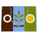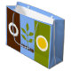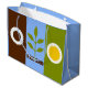 Bolsa de regalo grande con bandera de Fresno, California; bandera con tres bandas verticales de marrón, azul y verde, con ilustraciones estilizados de cog, planta y sol