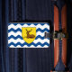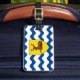 Etiqueta del equipaje con diseño con una bandera del condado histórico de Hertfordshire, en Inglaterra, Gran Bretaña; bandera con un ilustracion de una bandera en un escudo amarillo sobre fondo ondulado blanco y azul
