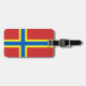 Etiqueta de equipaje con diseño con una bandera del histórico condado de Orkney, en Escocia, Gran Bretaña; bandera roja con cruz nórdica azul y amarilla