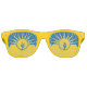 Gafas de sol con bandera de la ciudad Mesa, Arizona; bandera amarilla y azul con ilustraciones estilizados del desierto, cactus y sol naciente