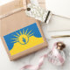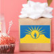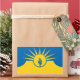 Pegatina con bandera de la ciudad Mesa, Arizona; bandera amarilla y azul con ilustraciones estilizados del desierto, cactus y sol naciente