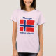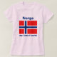 En el frente de esta camisa un título y un lema editable acompaña la bandera noruega con su cruz azul de la compensación fimbriada blanca en rojo. La parte posterior exhibe un mapa detallado de Noruega.