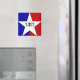 Magnet con la bandera de San Antonio, Texas. Una bandera azul y roja con estrella blanca y un ilustracion de Álamo en el medio