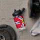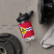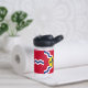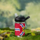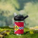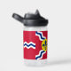 Botella de agua con bandera de la ciudad de St. Louis; bandera roja con olas blancas y azules y fleur-de-lys azules en círculo amarillo