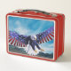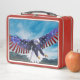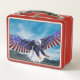El águila calva viene con un hermoso águila calva que vuela en el cielo con una bandera estadounidense en su pluma por todo su cuerpo, está en el cielo con las nubes detrás de él y una montaña debajo de él este diseño del 4 de julio